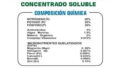 Es un nutriente con efecto bioestimulante formulado a base de fermentación natural enzimática, combinándose molecularmente con los minerales que actuan en forma de biotecnología de NITRÓGENO, FOSFORO Y POTASIO, biosaludables por la planta, enriquecidos por aminoácidos, micro nutrientes, quelatizados vitaminas, algas marinas y materia orgánica activada, que corrigen las deficiencias nutricionales y estimula de maner optima, el desarrollo vegetativo de las plantas, floración y fructificación.