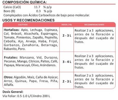 Es un producto formulado con Calcio,Boro y ácidos orgánicos de bajo peso molecular, incluye en todos aquellos mecanismos bioquímicos responsables de la formación de la PARED CELULAR, asi como los mecanismos de traslocación de sustratos y fotosintatos a través de dicha pared.